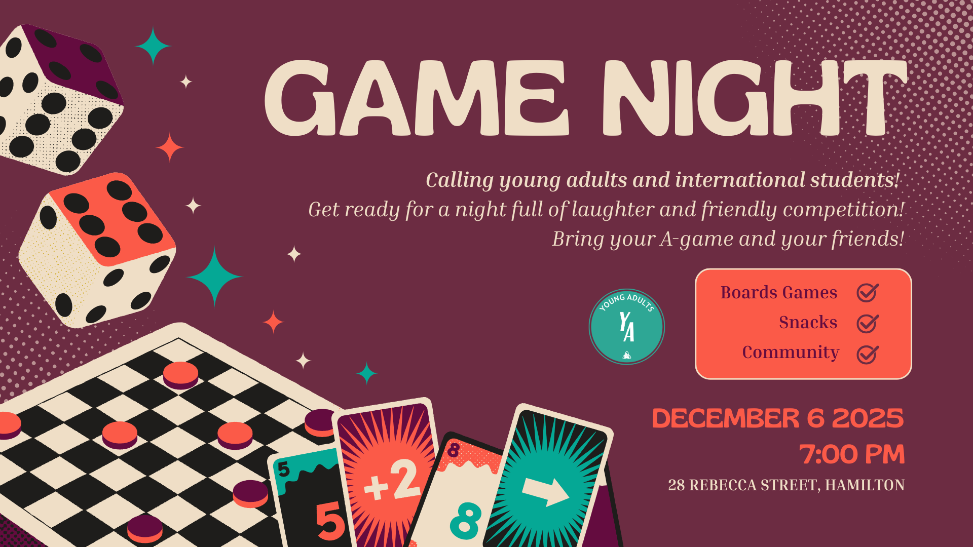 Back to All Events Game Night Saturday, December 6, 2025 7:00 p.m. 9:00 p.m. New City Church 28 Rebecca Street Hamilton, ON, L8R 1B4 Canada (map) Google Calendar ICS Calling young adults and international students! On December 6 at 7 pm, come to the church for a night full of laughter and friendly competition! Bring your A-game and your friends!