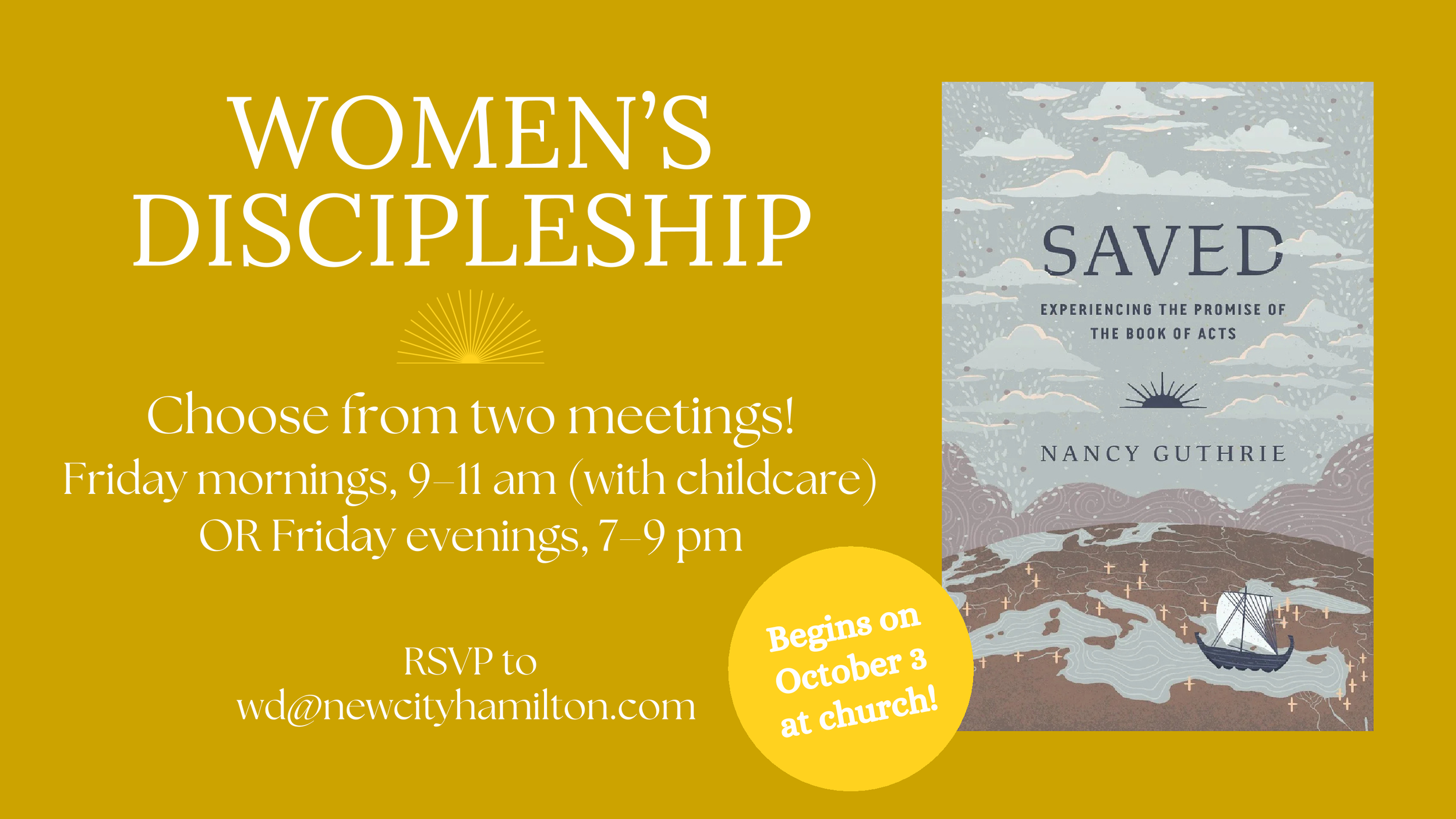 Beginning October 3, all women of New City (and their friends) are invited to join us on either Friday mornings (9–11 am) or Friday evenings (7–9 pm) to study "Saved: Experiencing the Promise of the Book of Acts" by Nancy Guthrie (you can purchase the Bible study version). Childcare will be provided during the morning session. Please email wd@newcityhamilton.com if you're planning to attend either of these exciting studies!